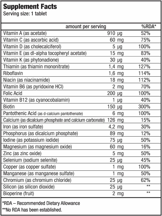 Agentes de carga (celulosa microcristalina, hidroxipropilmetilcelulosa), fosfatos de calcio, sulfatos de potasio, óxido de magnesio, ácido L-ascórbico, acetato de DL-alfa-tocoferilo, carbonato de calcio, antiaglomerantes (sales magnésicas de ácidos grasos, ácidos grasos), nicotinamida, sulfato ferroso, acetato de retinilo, D-pantotenato cálcico, óxido de zinc, sulfato de cobre, sulfato de manganeso, clorhidrato de piridoxina, extracto de pimienta negra (Piper nigrum), colecalciferol, mononitrato de tiamina, riboflavina, colorante (óxidos de hierro), ácido pteroilmonoglutámico, D-biotina, cloruro de cromo, yoduro de potasio, selenito de sodio, dióxido de silicio, filoquinona, cianocobalamina.