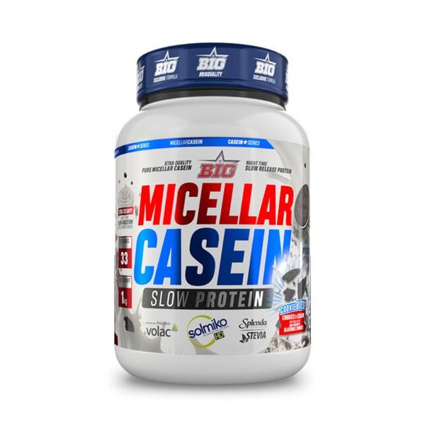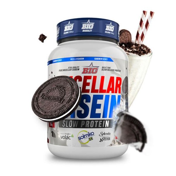 Micellar Casein Black Max Cookies de Big es un suplemento proteico en polvo que contiene una mezcla proteica de lenta digestión y gran calidad especialmente diseñada para utilizar por la noche antes de dormir, compuesta por una combinación de caseína micelar Solmiko® y concentrado de suero de leche Volactive®.