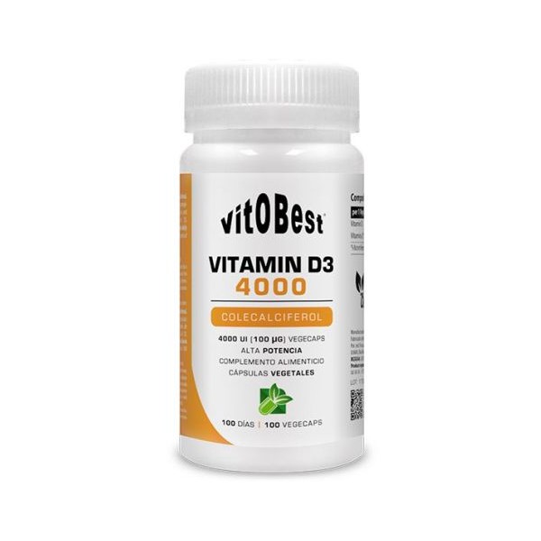Vitamin D3 4000 de Vitobest es un suplemento en cápsulas que contiene 4000 UI (100 µg) de vitamina D3 por cápsula y contribuye al funcionamiento normal de los músculos y el sistema inmunitario, y al proceso de división celular.