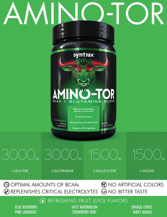 Amino-Tor de Syntrax es un suplemento en polvo con una fórmula que combina 6 gramos de BCAAs en una relación 2:1:1 con 3 gramos de glutamina por dosis de 11 gramos.