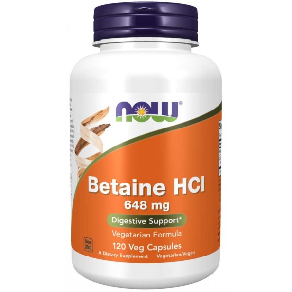 Betaine HCL 648 mg de Now Foods es un suplemento en cápsulas que proporciona 1.944 mg de betaína en combinación con enzima proteasa estable a los ácidos, diseñado para ayudar a mantener un equilibrio saludable de la flora intestinal y estimular la liberación de enzimas intestinales.