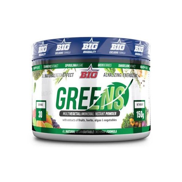 Greens de Big Nutrition es una fórmula en polvo que contiene una combinación de más de 50 extractos vegetales y minerales enfocada a la desintoxicación y normalización de nuestro sistema digestivo. Los elementos vegetales presentes en la formulación contienen fruta variada, verduras, extractos de hierbas, algas y verdes de cereales como el trigo, la cebada o la alfalfa.