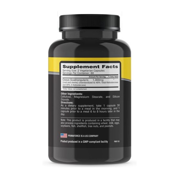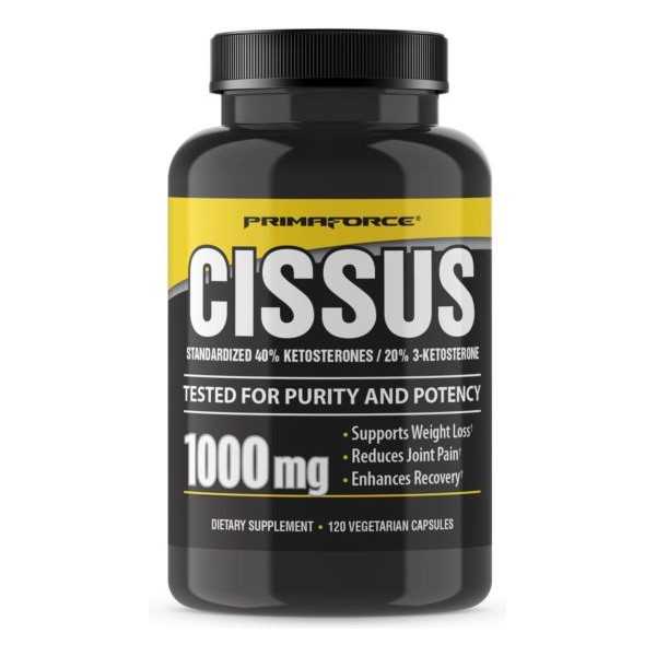 Cissus de PrimaForce es un suplemento en cápsulas que proporciona 1.000 mg por servicio de 2 cápsulas de extracto de cissus quadrangularis (estandarizado para un 40% de ketosterona y un 20% de 3-ketosterona).