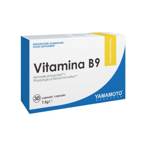 Vitamina B9 de Yamamoto® Nutrition es un suplemento en cápsulas que proporciona 400 mcg de ácido fólico por cápsula.