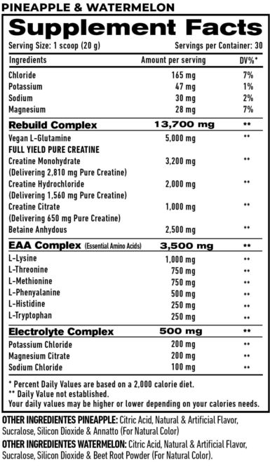 Vegan L-Glutamine, 3 Types of Creatine, Betaine Anhydrous, EAA Complex, Lysine, L-Threonine, L-Methionine, L-Phenyalanine, L-Histidine, L-Tryptophan, Electrolyte Complex.