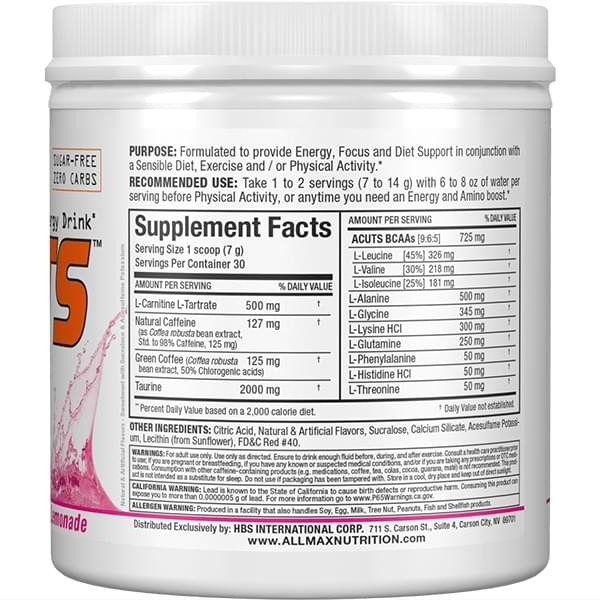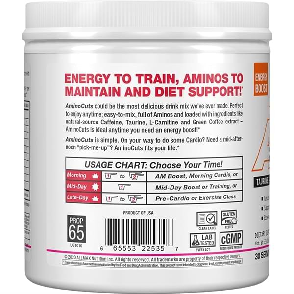 Para combatir la fatiga, AllMax Nutrition ha incluido extracto de grano de Coffea robusta (98% de cafeína) y extracto de café verde. La cafeína sigue siendo uno de los suplementos deportivos más investigados actualmente en el mercado, que exhibe efectos notables en el enfoque mental, la claridad y los niveles generales de energía, lo que le brinda el impulso intra-entrenamiento que necesita para seguir empujando (¡o tirando!). La taurina también se incluye para anular el "choque" común que se puede experimentar después de tomar estimulantes. Finalmente, A:Cuts contiene Acetil L-carnitina, un ingrediente muy popular por sus efectos altamente beneficiosos sobre la pérdida de grasa. La L-Carnitina es responsable del mantenimiento del metabolismo energético en todas las células del organismo, transporta los ácidos grasos a través de la membrana de las células hasta las mitocondrias donde son quemados para luego transformarse en energía. La conversión de la grasa en energía es el motivo principal por el que la L-Carnitina es de gran ayuda para los atletas.