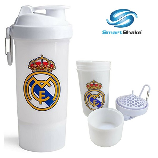 Para los aficionados del Real Madrid, la compañía especialista en la fabricación de cocteleras Smartshake, ha diseñado la solución definitiva para aquellos que desean tener una capacidad de almacenamiento más grande, con un total de 800 ml y un compartimento extra para suplementos en polvo, cápsulas, frutas, etc...