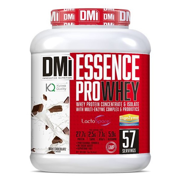 Essence Pro Whey de DMI Innovative Nutrition es un suplemento en polvo que contiene una mezcla proteica de alta calidad de concentrado de proteína de suero y aislado de proteína de suero complementada con L-glutamina (Kyowa Quality®), la mezcla de enzimas digestivas DigeZyme® (amilasa, proteasa, lipasa, lactasa, celulasa) y el complejo probiótico LactoSpore® (Bacillus coagulans).