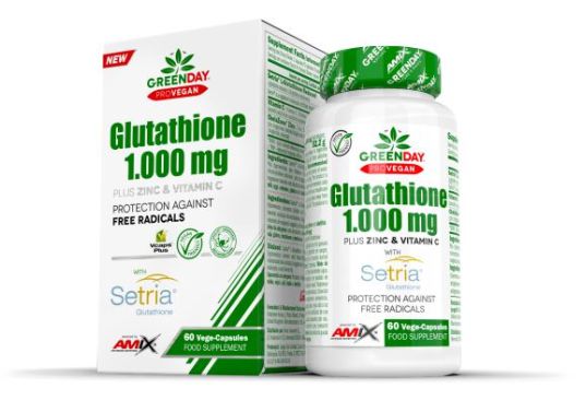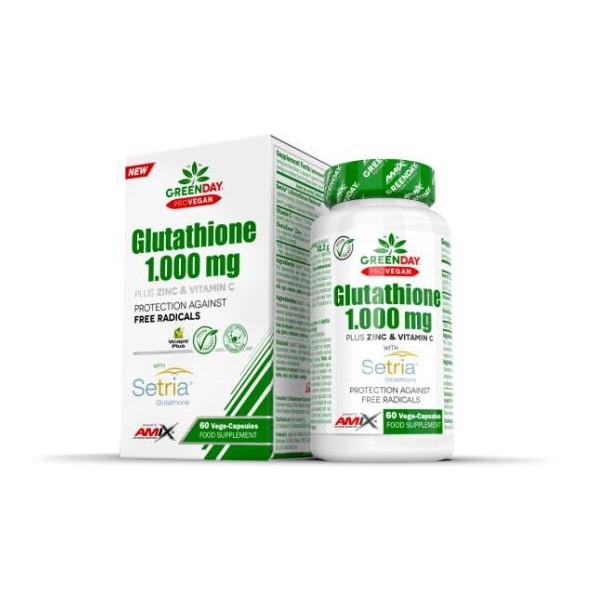 GreenDay® Glutathione 1.000 mg Setria® de Amix es un suplemento en cápsulas que proporciona 1.000 mg de L-Glutation reducido (Setria® Glutathione) potenciado con vitamina C y zinc ChelaZone® para aumentar el nivel de glutatión en sangre y proteger a las células frente al estrés oxidativo.