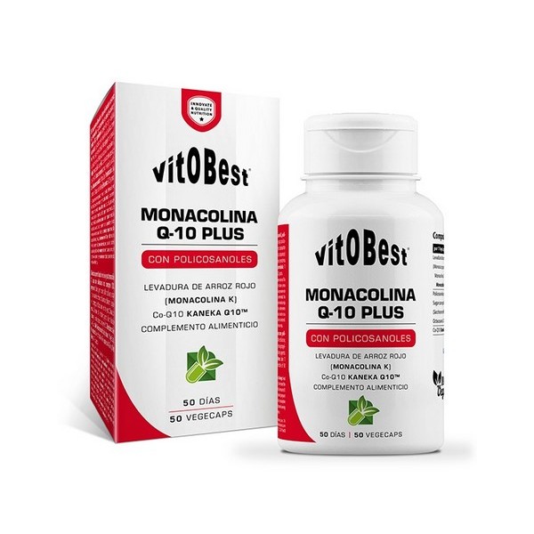 Monakolina Q-10 Plus de Vitobest® es un suplemento en cápsulas elebaorado a base de levadura de arroz rojo (4% de monacolina K), policosanoles de caña de azúcar (10% octacosanol) y coenzima Q10 fermentada por levadura (Kaneka™),