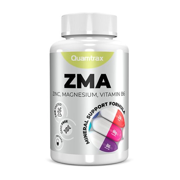 ZMA de Quamtrax Nutrition es un suplemento en cápsulas que contiene una combinación de zinc, magnesio y vitamina B6 diseñada para incrementar los niveles de energía, fuerza y de testosterona.