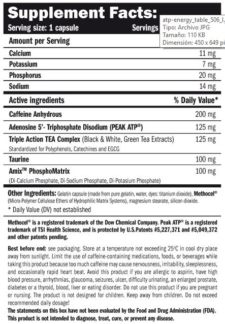 Cafeína, Adenosina 5 - Trifosfato Disódico (PEAK ATP®), Triple Action TEA Complex (Té Negro (Extracto de Té Negro), Té Blanco (Extracto de Té Blanco), Té Verde (Extracto de Té Verde)), Taurina, Amix PhosphoMatrix (Fosfato Dicálcico, Fosfato Disódico, Fosfato Dipotásico), Methocel® (Micro-polímero hidrofilico de éteres de celulosa de sistemas de matriz.)