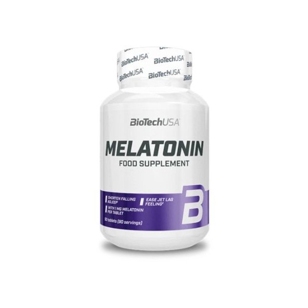 Melatonin de BioTech USA es un suplemento en tabletas que contiene 1 mg de melatonina por dosis de 1 tableta.