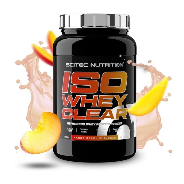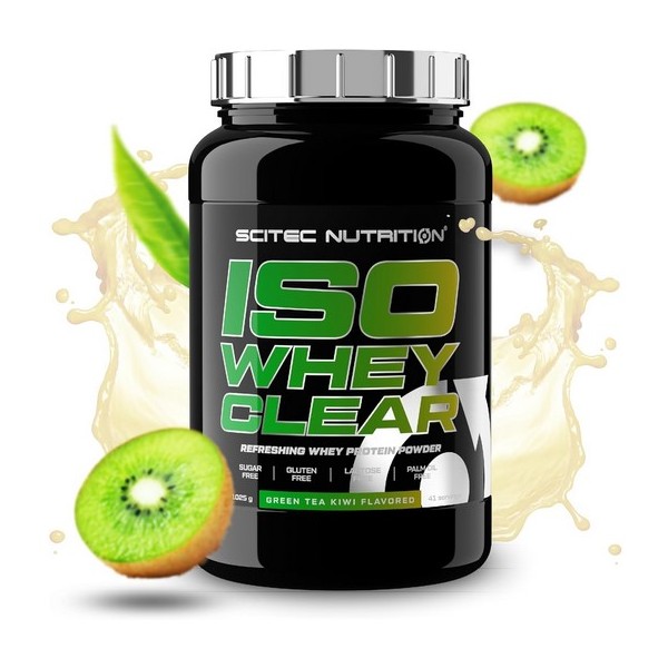 Iso Whey Clear de Scitec Nutrition es un suplemento proteico en polvo que contiene aislado de proteína de suero de alto valor biológico y una excelente biodisponibilidad, que a diferencia de los cremosos batidos proteicos convencionales con sabor a leche, al añadirle agua se convierte en una refrescante bebida con sabor a kiwi con té verde o melocotón con mango.