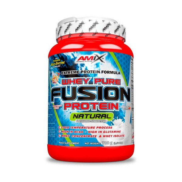 Whey-Pro Fusion Natural de Amix™ Nutrition es una excelente mezcla proteica que combina el concentrado de suero de leche y el aislado de suero de leche de la máxima calidad con un alto contenido en aminoácidos tanto ramificados como esenciales.
