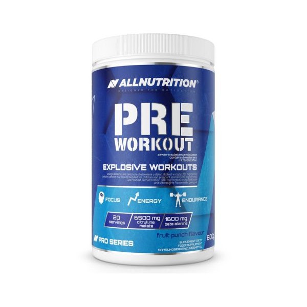 PRE Workout de AllNutrition es un suplemento en polvo para tomar antes del entrenamiento que contiene una fórmula avanzada para ayudarte a mejorar el rendimiento físico gracias a una potente dosis de 6,5 g de citrulina malato, 3,5 g de BCAAs con ratio 2.1.1., 3 g de leucina, además de beta alanina, betaína anhidra, clorhidrato de creatina y muchos ingredientes más.