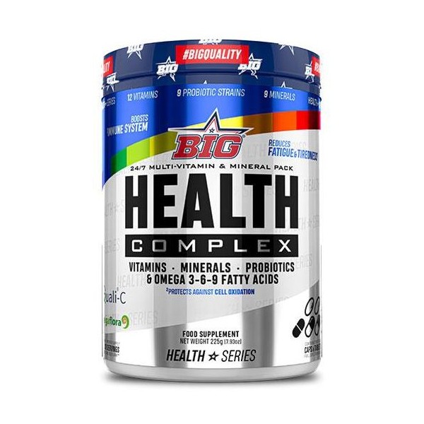 Health Complex de la gama BIGscience es un nuevo complejo multi-vitamínico y mineral que contiene una combinación de 12 vitaminas y 9 minerales a los que se han añadido un aporte de ácidos grasos saludables omega 3-6-9 y un complejo de probióticos basados en la patente Megaflora® 9Evo, además de un aporte extraordinario de vitamina C basado en la prestigiosa patente Quali-C® y una dosis de ácido linoléico conjugado (CLA).