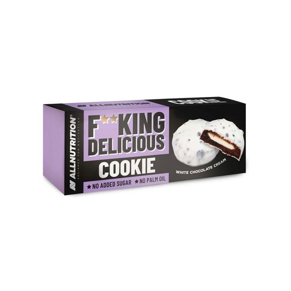 Fitking Delicious Cookie White Choco Cream de AllNutrition son unas deliciosas galletas de cacao recubiertas de chocolate blanco con trozos de galleta negra y rellenas de crema de leche, elaboradas sin azúcares añadidos ni aceite de palma.