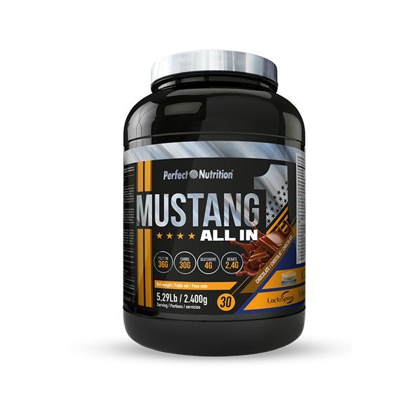 Mustang All In 1 de Perfect Nutrition es un suplemento en polvo que contiene una fórmula todo en uno con una combinación de 36 g de proteínas de alta calidad, (concentrado de suero 80%, aislado de suero 90% y caseína micellar); 30 g de carbohidratos de última generación; una dosis clínica de 3 g de monohidrato de creatina; una mezcla de especial de aminoácidos que incluye 2,4 g de BCAAs, 4 g de glutamina, arginina, y más; 2 mezclas patentadas de enzimas digestivas: DigeZyme® y Tolerase L®; el probiotico patentado de Lactospore; optimizadores de la testosterona; con HMB, citrulina malato, beta alanina y mucho más.