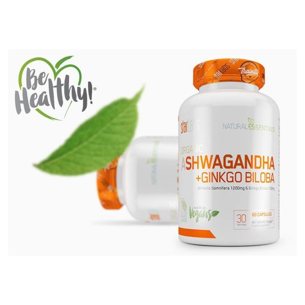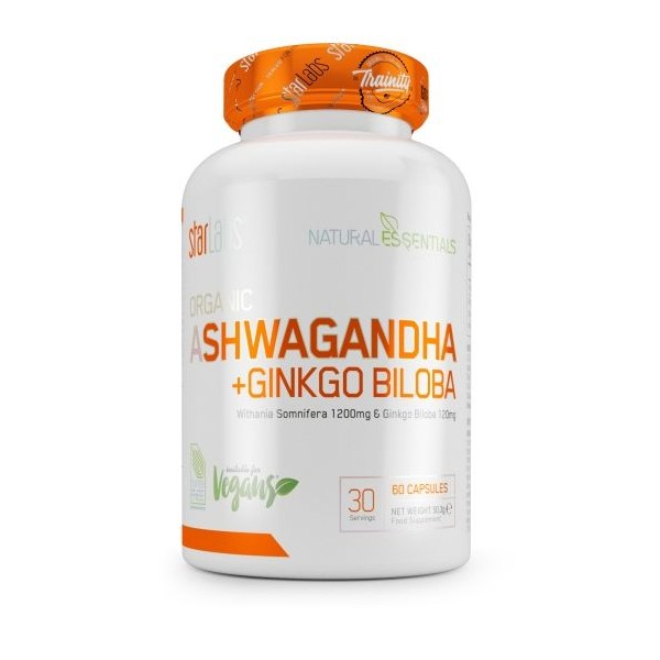 Ashwagandha + Ginkgo Biloba de StarLabs es un suplemento en cápsulas que te proporciona 1.200 mg de Aswagandha orgánica con una alta concentración de whitanolidos y 120 mg de Ginkgo Biloba al 24% de glicósidos flavonoides y 6% de lactonas de terpeno.