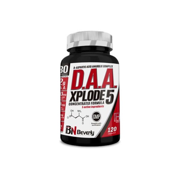 D.A.A. Xplode5 de Beverly Nutrition es una fórmula en cápsulas que proporciona 2 gramos de ácido de aspártico por servicio de 4 cápsulas, que además también contiene una dosis efectiva de extracto de fenogreco, extracto de coleus forskohlii, extracto de Saw Palmetto y vitamina C para un mayor efecto anabólico.