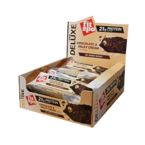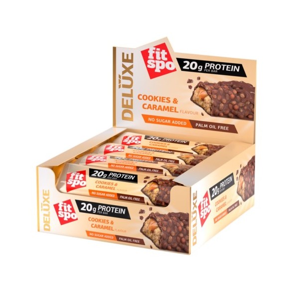 Deluxe Protein Bar de FitSpo son unas deliciosas barritas de 60 gramos que proporcionan unos 20 g de proteína, elaboradas sin azúcares añadidos y que podrás disfrutar antes, durante y después del entrenamiento o en cualquier momento del día que necesites una energía instantánea y una rápida recuperación.
