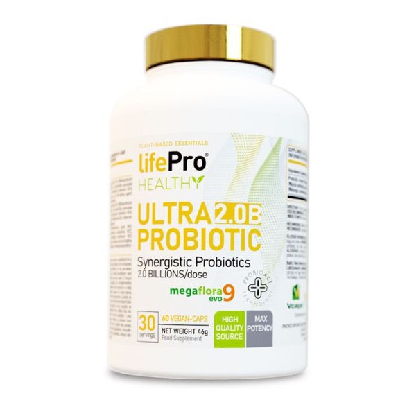 Ultra Probiotic 2.0B de LifePro Nutrition es un suplemento en cápsulas que contiene una mezcla de 9 especies de probióticos diferentes, que cuenta con la patente Megaflora 9 EVO, para garantizar su calidad y biodisponibilidad en el organismo, que ha sido diseñado para optimizar el funcionamiento del aparato inmunológico.