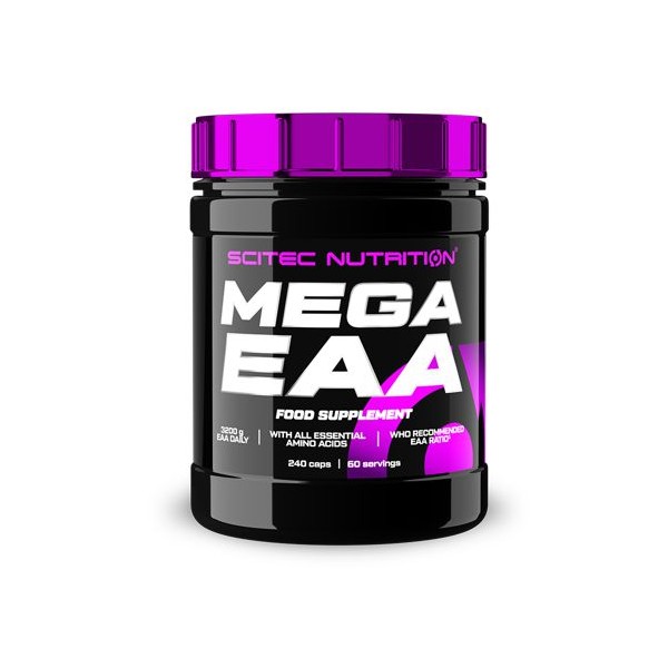 Mega EAA de Scitec Nutrition es un suplemento en cápsulas que contiene una fórmula avanzada con todos los aminoácidos esenciales en las proporciones recomendadas por la OMS.