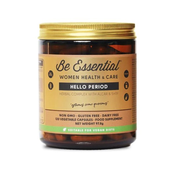 Hello Period de Be Essential es un suplemento en cápsulas vegetales que contiene una fórmula a base de Acetil-L-Carnitina (ALCAR), adaptógenos como la Ashwagandha, Rhodiola Rosea y L-theanina, así como 5-HTP, isoflavonas de soja no transgénica y minerales como el zinc y el selenio, desarrollado especialmente para ayudar a revertir las alteraciones hormonales presentes en la Amenorrea Hipotalámica Funcional o AHF.