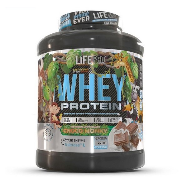 Whey Protein Choco Monky de LifePro Nutrition es un suplemento en polvo que contiene el 100% de concentrado de proteína de suero WPC Lacprodan® SP-8011 Instant, una de las mejores materias primas existentes en el mercado producida por Arla Foods que se ha enriquecido con Tolerase® L para mejorar significativamente la digestión de la lactosa y que ahora podrás disfrutar con el sabor único e innovador choco monky, logrado gracias a la combinación de trocitos de galleta Lotus y cacao alcalinizado.