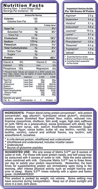 MATRIX 2.0 contiene una combinación de 3 proteínas de la más alta calidad incluyendo proteína de suero, Caseína Micelar y Albúmina de huevo (Proteína de clara de huevo).