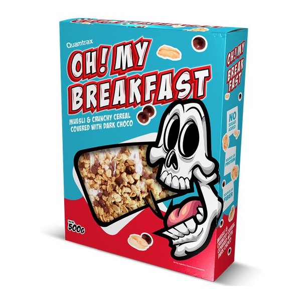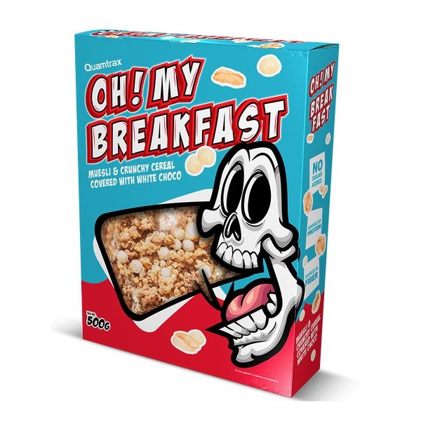 Oh! My Breakfast es una gran alternativa de desayuno y brunch, rico en fibras y fuente de proteínas, basado en copos de avena inflados con un extra de salvado de avena, mezclados con esferas proteicas de cereal crujiente con cobertura de chocolate blanco o chocolate negro que aportan proteína de suero y proteína de arroz, por supuesto sin azúcares añadidos.