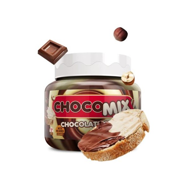 ChocoMix Chocolate Cream es una deliciosa crema de chocolate de dos colores con un delicioso toque de avellana que te sorprenderá desde el primer bocado. ChocoMix Chocolate Cream está elaborada sin azúcares añadidos y no contiene aceite de palma.