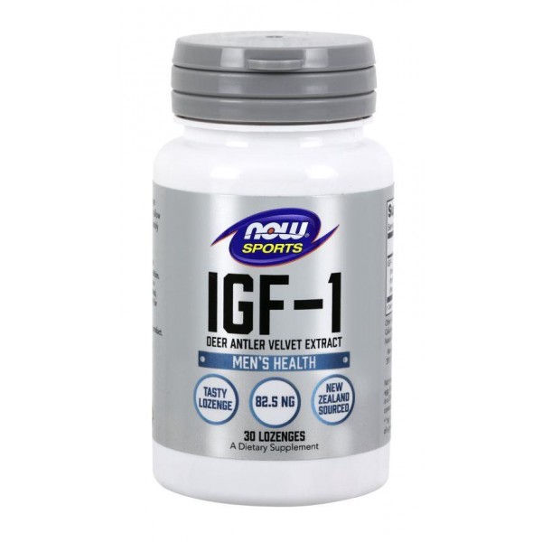 IGF-1 de Now Foods es un suplemento en tabletas con sabor que proporciona 82 ng de IGF-1 (Factor de crecimiento similar a la insulina-1) (de 3,3 mg de extracto de terciopelo de asta de ciervo) (de origen neozelandés) por dosis de 1 tableta.