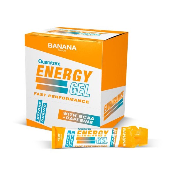 Energy Gel with BCAA + Caffeine de Quamtrax son unos geles energéticos con BCAAs, cafeína y sabor a banana compuestos por diferentes tipos de carbohidratos de absorción rápida que favorecen de manera inmediata la recuperación del glucógeno, por lo que son ideales tanto para proveer de un aporte energético explosivo como una gran recuperación casi inmediata.