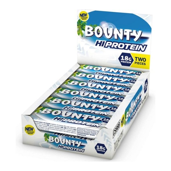 Las barritas Bounty HI Protein de Snickers and Mars Protein Bars son una versión fitness de las deliciosas barritas de coco recubiertas de chocolate de toda la vida enriquecidas con 18 gramos de proteína por unidad.