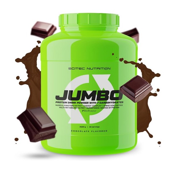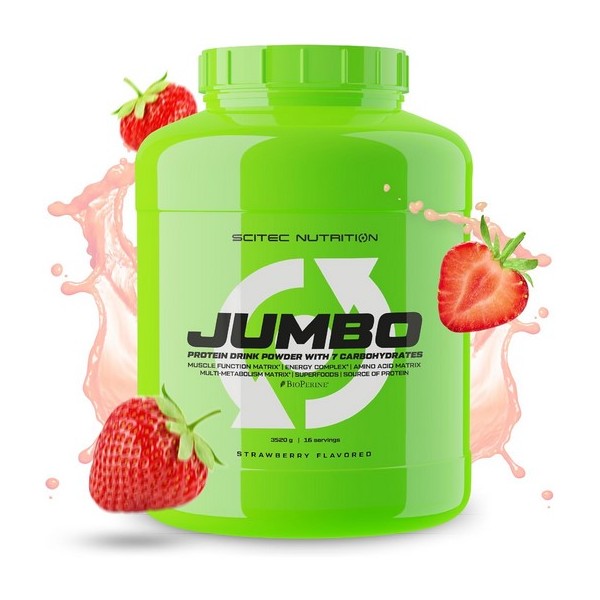 Jumbo de Scitec Nutrition es un suplemento en polvo que contiene una fórmula todo en uno para ayudarte a ganar fuerza y masa muscular con proteína de suero de la más alta calidad, una matriz con 6 tipos de carbohidratos diferentes, creatina, importantes aminoácidos, una matriz metabólica con BioPerine®, vitaminas, minerales y una combinación de superalimentos.