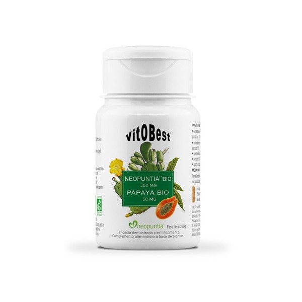 Neupuntia + Papaya BIO de Vitobest es un suplemento en cápsulas que proporciona 1200 mg de un extracto completamente natural derivado del cactus Opuntia y 200 mg de extracto fruta de papaya, por dosis de 4 cápsulas.