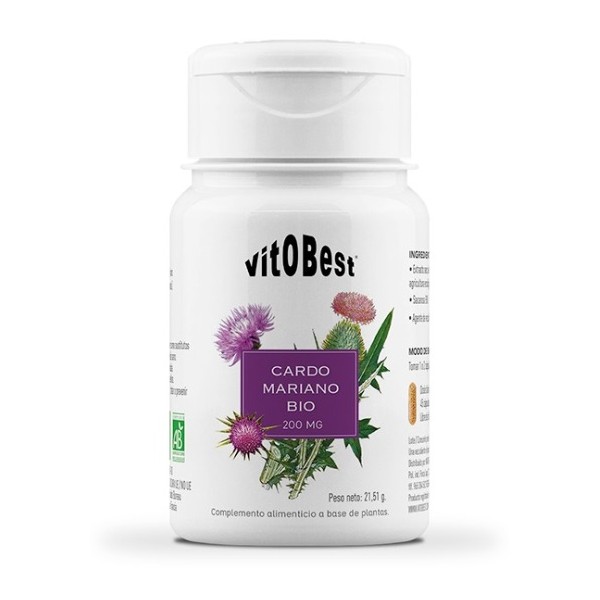 Cardo Mariano BIO de Vitobest es un suplemento en cápsulas que proporciona 400 mg de extracto seco de semillas de cardo mariano (3% silimarina) (equivale a 2800 mg de planta), por dosis de 2 cápsulas.
