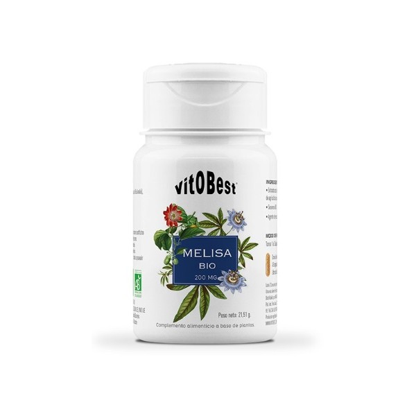 Melisa BIO de Vitobest es un suplemento en cápsulas que proporciona 600 mg de extracto de hojas de melisa (1 % ácido rosmarínico) (equivalente a 5400 mg de planta), por dosis de 3 cápsulas.