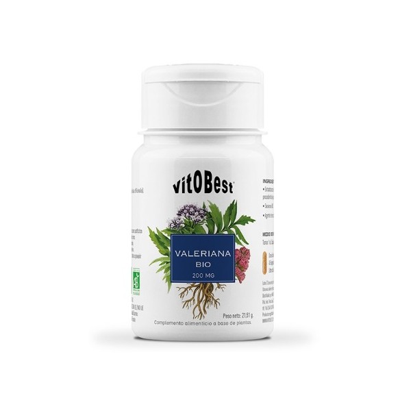 Valeriana BIO de Vitobest es un suplemento en cápsulas que proporciona 400 mg de extracto seco de raíces de valeriana (0,4 % ácido valerínico), por dosis de 2 cápsulas.