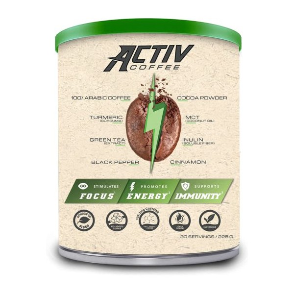 Activ Coffee está complementado con semilla de cacao en polvo, cúrcuma orgánica en polvo, inulina, triglicéridos de cadena media (MCT), extracto de hoja de té verde, cafeína anhidra, extracto de semillas de café, polvo de canela, vitamina C y extracto de pimienta negra.