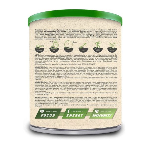 Su fórmula desarrollada por especialistas te proporciona todos los beneficios del café además de un sin fin estimularte convenientemente con un dosis extra de energía, reforzar el sistema inmunológico, mejorar la concentración mental, favorecer la diuresis y proporcionar una fuente de fibra saludable.