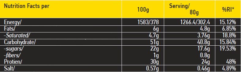Mezcla de proteínas (concentrado de proteína de suero, caseinato de calcio, proteína de soja), edulcorante: sorbitol, recubrimiento de cacao 20% (azúcar, aceite de palma hidrogenado, polvo de cacao, suero en polvo, leche desnatada en polvo, lecitina de soja), glicerol, aperitivos de cereales extruidos (crujientes de arroz, harina de trigo, de maíz, azúcar, emulsionante: mono y diglicéridos de ácidos grasos), azúcar, leche desnatada en polvo, aceite de coco, fructosa, cacao, jarabe de glucosa, polidextrosa, emulsionante: mono y diglicéridos de ácidos grasos), gelatina, emulsionante: lecitina de soja, conservante sorbato de potasio, regulador de la acidez: ácido cítrico, sabor: chocolate, agentes humectantes: carboxi metil celulosa.