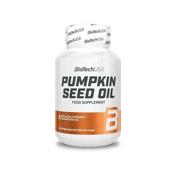 Pumpkin Seed Oil de BioTech USA es un suplemento en perlas que proporciona 600 mg de aceite de semilla de calabaza por dosis de 1 perla.