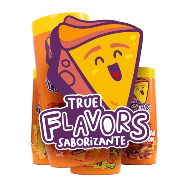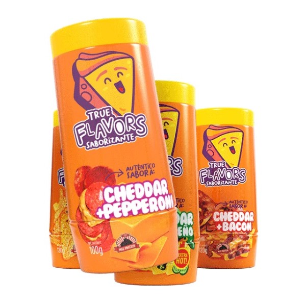 Los nuevos saborizantes True Flavors se presentan en un llamativo envase de 100 g (con 20g extra de regalo sólo por tiempo limitado, excepto Cheddar&Pepperoni) y en una variedad de 4 explosivos sabores para condimentar cualquier comida que te apetezca: ¡Cheddar&Nachos, Cheddar&Bacon, Cheddar&Jalapeños y Cheddar&Pepperoni!