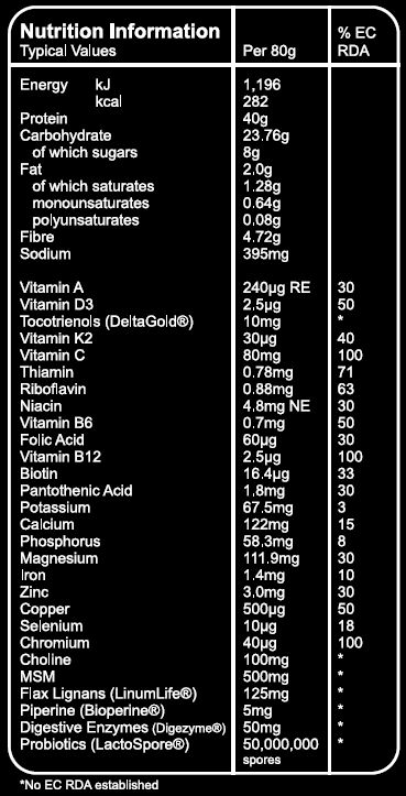 Mezcla de proteínas (proteína de la leche, Ultra Concentrado de proteína de suero filtrado, péptidos de glutamina (derivado de la proteína de trigo), proteína de clara aislada), CarboBioticsTM bajo índice glucémico Complex (harina de avena orgánica, harina de cebada orgánica, trehalosa, prebióticos (fructooligosacáridos), probióticos (Lactospore ® (Bacillus coagulans))), colorantes naturales (cacao en polvo (sabores de chocolate solamente), (betanina (frambuesa y de fresa solamente), betacaroteno (sabores del plátano y vainilla solamente)), vitamina y mezcla mineral (citrato de magnesio, L-Colina bitartrato, ácido ascórbico (vitamina C), tocotrienoles como DeltaGold ® (35% tocotrienoles total de 84-92% que Delta-tocotrienoles, 16.8% de gamma-tocotrienoles) obtenidos a partir de Achiote, Zinc monometionina, bisglicinato ferroso, cobre aspartato, niacina (Nicotinimide), menaquinona (vitamina K2), acetato de retinol (vitamina A), L-selenometionina, Calcio D-pantotenato (vitamina B5), riboflavina (vitamina B2), clorhidrato de tiamina (vitamina B1), clorhidrato de piridoxina (vitamina B6), colecalciferol (vitamina D3), picolinato de cromo, ácido Pteroylmonoglutamic (ácido fólico), D-biotina, metilcobalamina (vitamina B12)), espesante (carboximetilcelulosa), aromatizantes, metilsulfonil metano, lino Lignan Concentrado (LinumLife ® 4 -6% diglucósido secoisolariciresinol (SDG)), emulgente (lecitina de soja), edulcorantes artificiales (acesulfame K, sucralosa), complejo de enzimas digestivas (Digezyme ® (amilasa, celulasa, lactasa, lipasa y proteasa neutra)), piperina (Bioperine ®) .