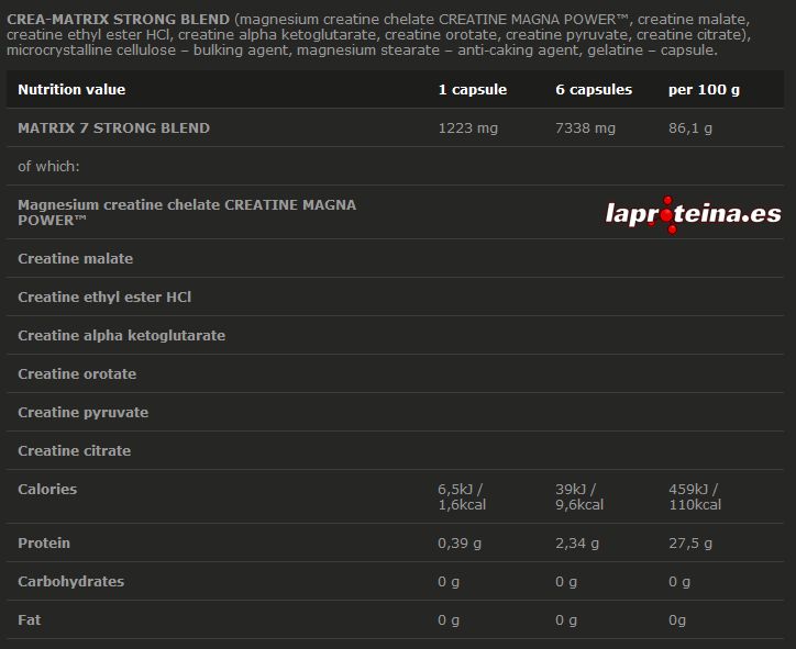 Creatine Strong Matrix 7 es una creatina extremadamente potente, donde la palabra "strong" no es sólo un adorno, sino que refleja la verdadera naturaleza de este producto y muestra la dinámica de su acción.