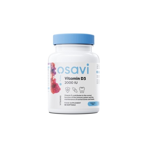 Vitamin D3 2000 IU de Osavi es un suplemento en perlas que contiene 2000 IU de vitamina D3 (colecalciferol) disuelta en aceite MCT de coco.