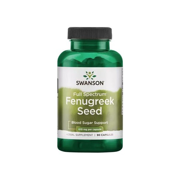 Full Spectrum Fenugreek Seeds de Swanson es un suplemento en cápsulas que proporciona 610 mg de semilla de fenogreco (semilla) por dosis de 1 cápsula.